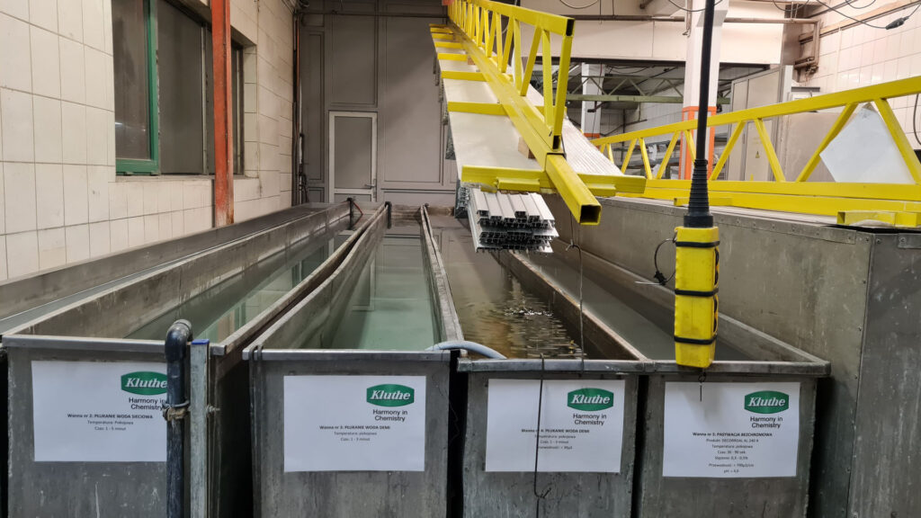 Doskonałą przyczepność powłoki i odporność na warunki atmosferyczne malowanych profili aluminiowych uzyskujemy poprzez zastosowanie w procesie przygotowawczym pełnej obróbki chemicznej polegającej na: