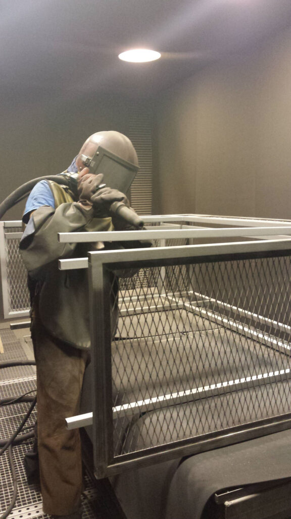 Dysponujemy ponadto komorą śrutowniczą o wymiarach 6 x 3 x 3 m służącą do przygotowania elementów stalowych. Śrutowanie usuwa wszelkie zanieczyszczenia i zapewnia właściwą przyczepność farby proszkowej do podłoża.